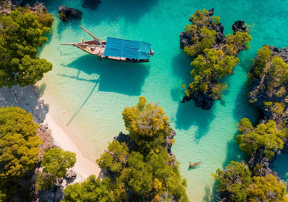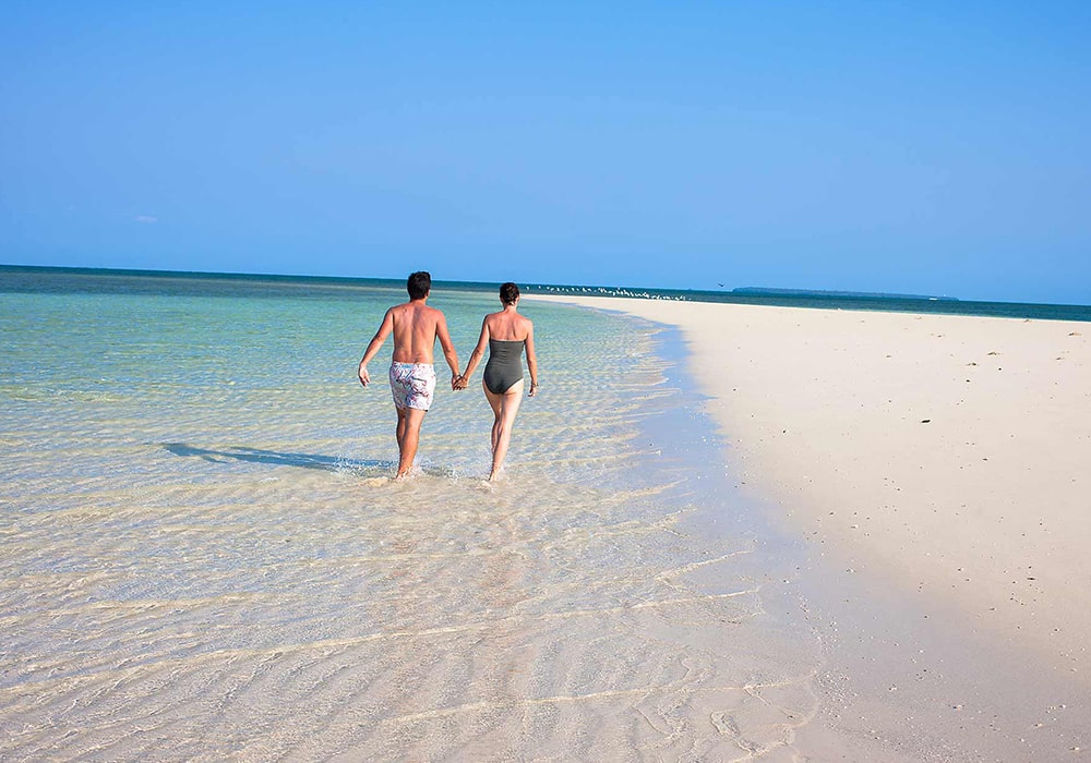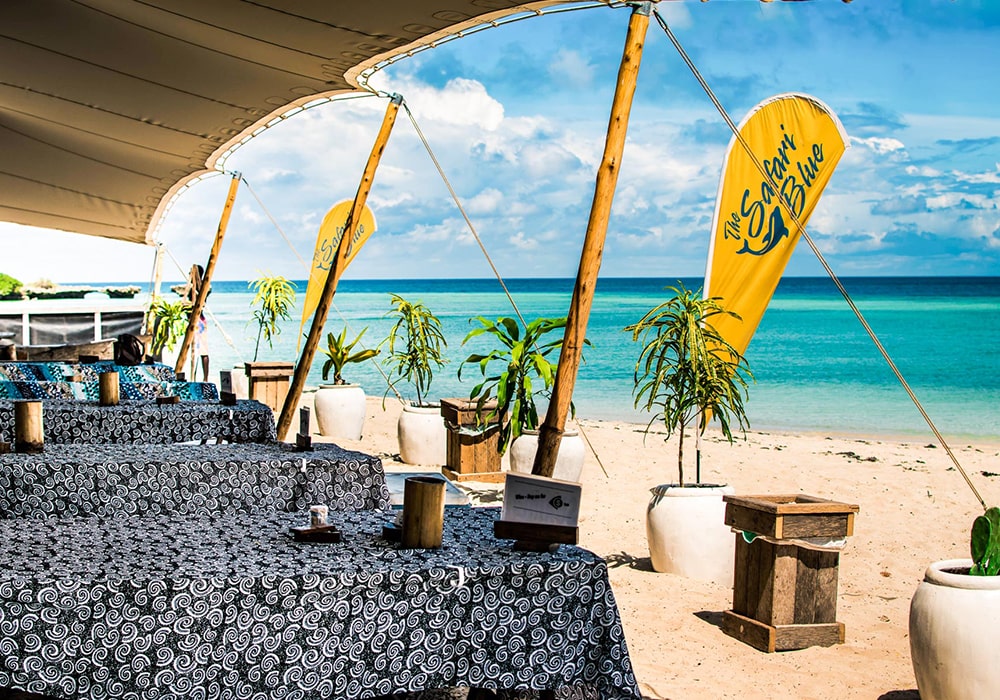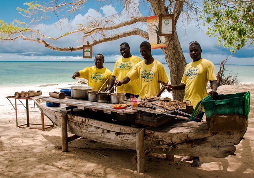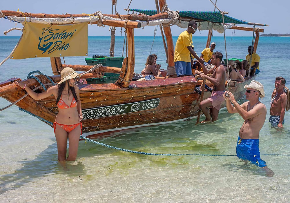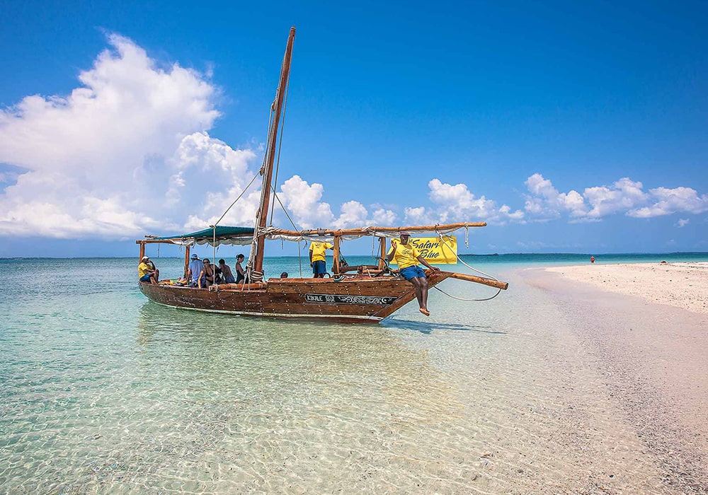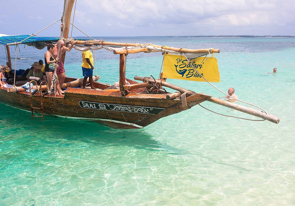 Your full-day Safari blue experience will start embarking on a traditional dhow from the Fumba fishing village. Primary the dhow, introduced by the Arabs, was a trading vessel used by the Swahili. They could be massive – it once transported a giraffe to the Chinese Emperor. Today they reflect the craftsmanship of Zanzibari timbers. Aboard you will get to know the sea and shores of Zanzibar, islands and coral reefs of a pristine conservation region, the Menai bay, with a chance to take a dip in front of the naturally occurring sandbanks. After a refreshing swim rest on the white sand with a coconut tree providing shade. The crystal clear turquoise water is appreciated by the dolphins & you can easily see some swimming around the area.