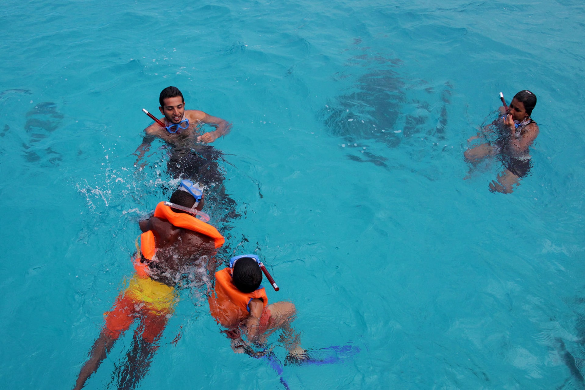 While exploring the reef, you have a great chance to meet a dolphin at a very close range, they like the waters of the reef and often swim with divers. If the time is right, you may even see the green turtles heading to lay their eggs at the beach. After this exceptional snorkeling experience, you'll be taken to a nearby sandbank for a relaxed delicious seafood lunch.