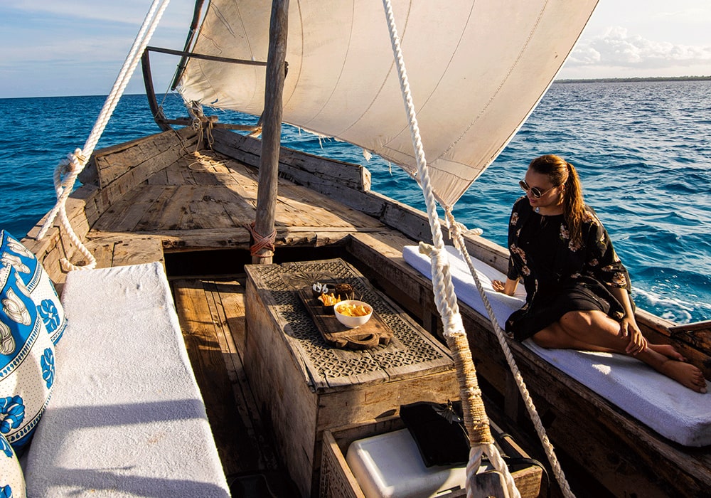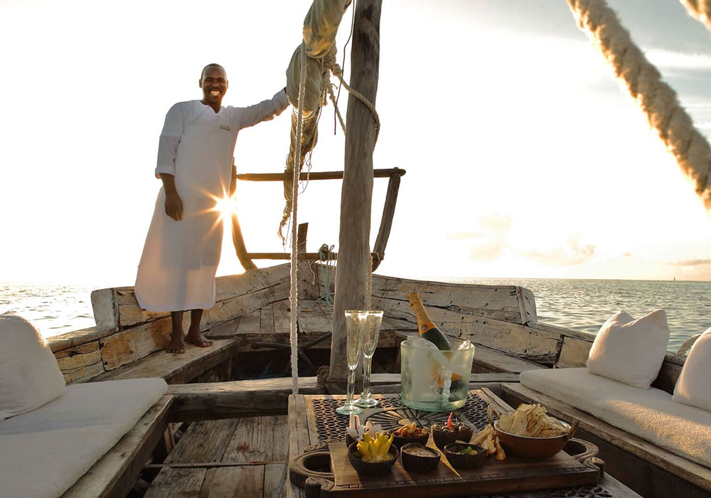 Step onto the decks of the vessel, relax and sail away on a magical sunset cruise to end your day. The cruise leaves stone town in the late afternoon to cruise along the coast, slicing through the clear turquoise water. The sounds of the bustle of busy people in stone town faint in the distance until they seem only in a memory. Musicians take over playing songs of love and loss, as the butler serves and keeps you your glass topped up with your choice of a selection of beers, wine and sodas encouraging you to sink back into the cushions and enjoy the romance of Africa while watching the scenery drift by.